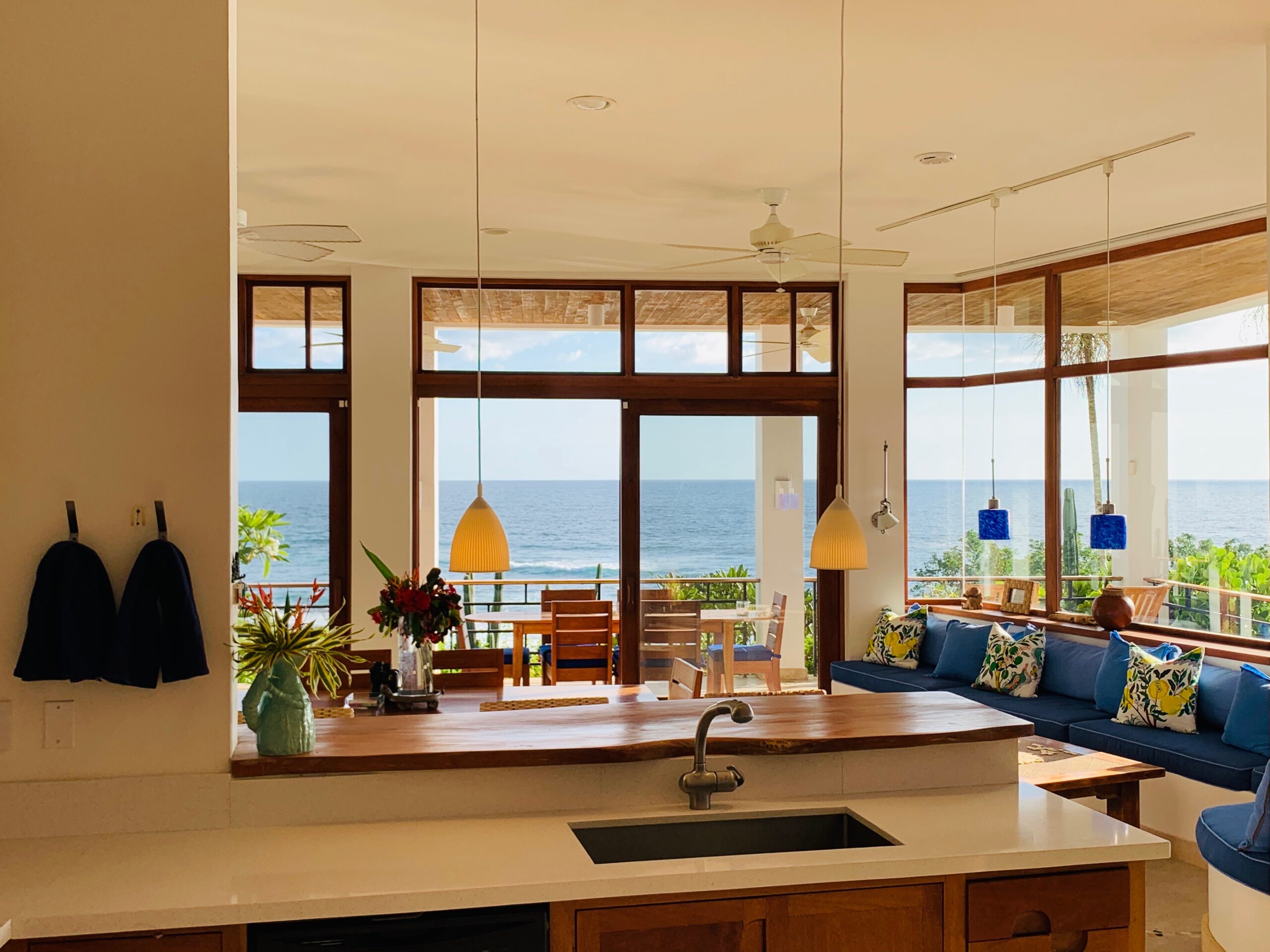 Steps from the world-renown Playa Negra surf break and situated within the secure gated community of Rancho Playa Negra, this five-bedroom home is positioned on a point with sweeping Pacific Ocean views. Casa Ohana has an open floor plan with the living room, dining area, kitchen and bedrooms open to wrap-around decks and spectacular views. Four bedrooms offer breathtaking vistas of the ocean and sunsets. The fifth bedroom provides a serene outlook onto a tropical tree canopy leading to nearby mountains.